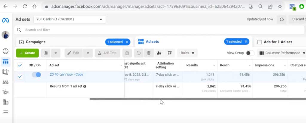 Facebook.com/adsmanager מכניס אותנו למנהל המודעות, ובוחרים בחשבון המודעות שבו אתם רוצים לעבוד.