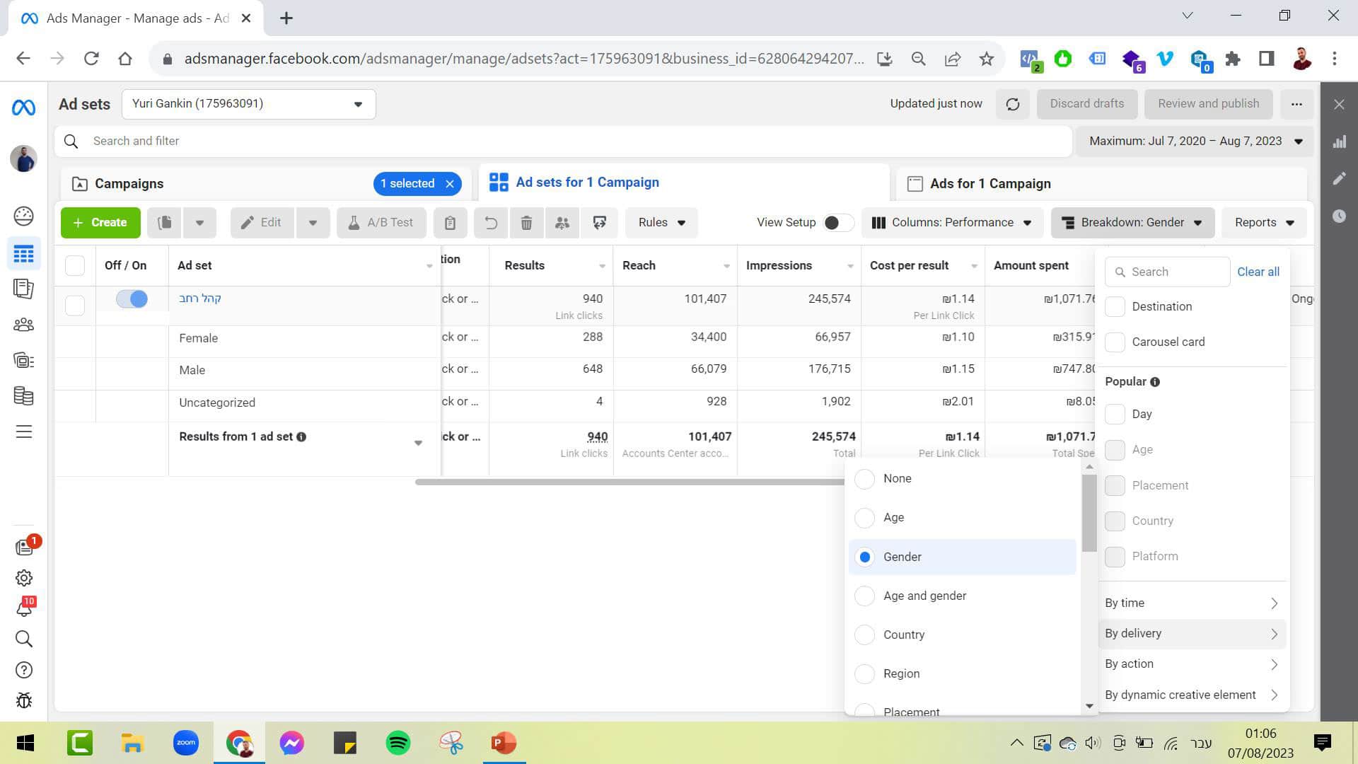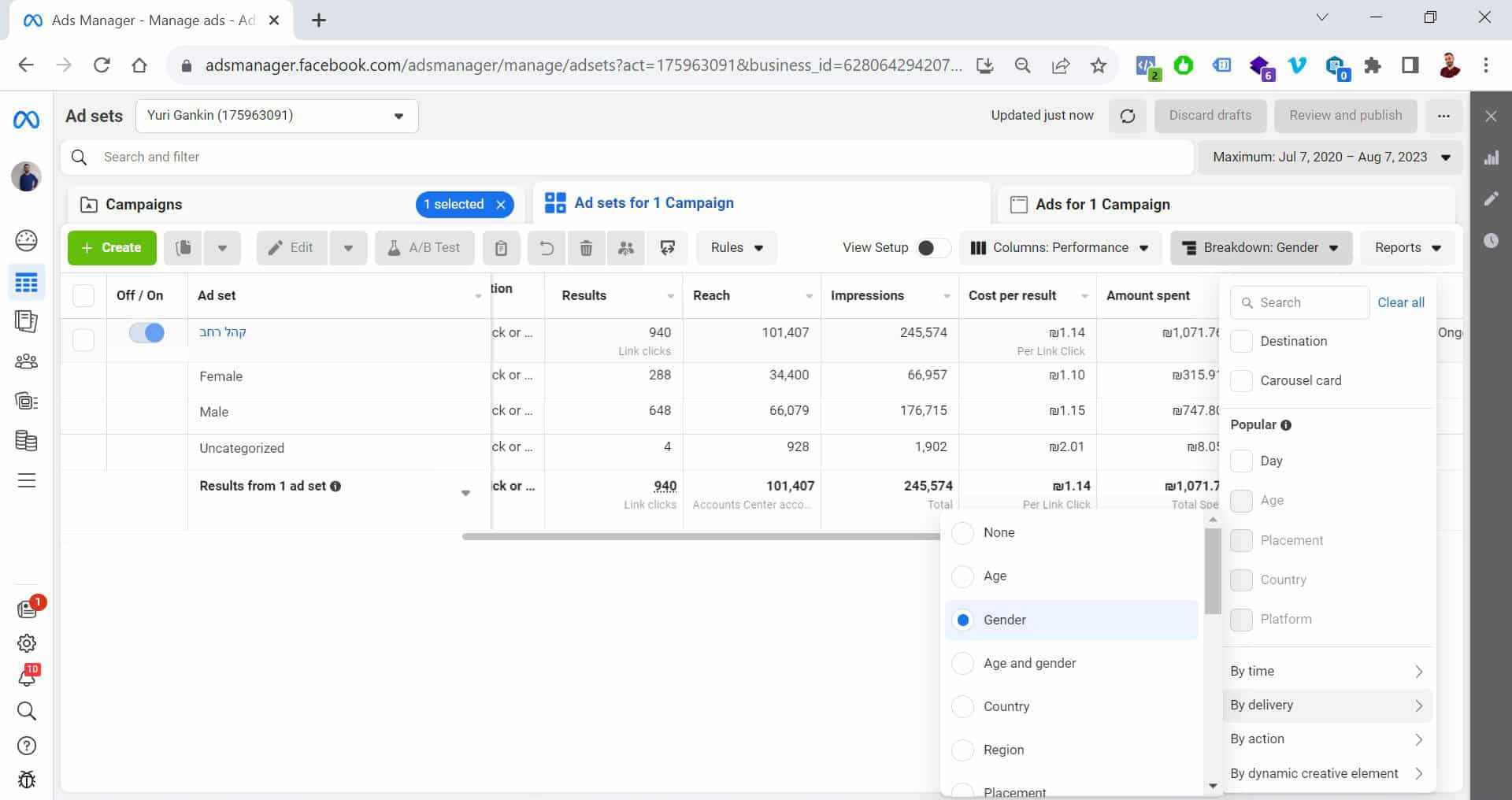 בלחיצה על הכפתור Breakdown ואז יש לי פה Breakdown by time, by delivery ו-by action. בגדול מה שמעניין אתכם זה ה- delivery ואז הנה החלוקה: Age, gender וכו׳. בוא נעשה Gender לצורך הדיון. אני רוצה לקבל את תוצאות הקמפיין לפי מיגדר.