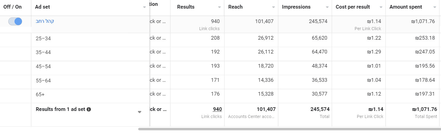 בקמפיין הזה מטורגטים קהלים מגיל 18-24 ולא מעבר. אתם יכולים לראות את התפלגות הגילאים. גם כאן יש פערים בין קבוצת הגיל האמצעית לקבוצות הגיל האחרות. האם זה אומר שמעתה אני צריך להתמקד רק בקבוצת הגיל של 25-34 ? לא. מקמפיין אחד לא מקבלים החלטות גורפות שקשורות למשל לחלוקת גילאים.