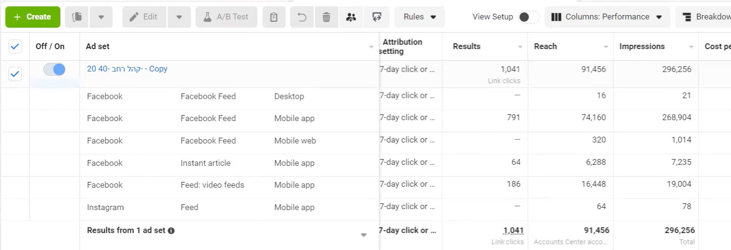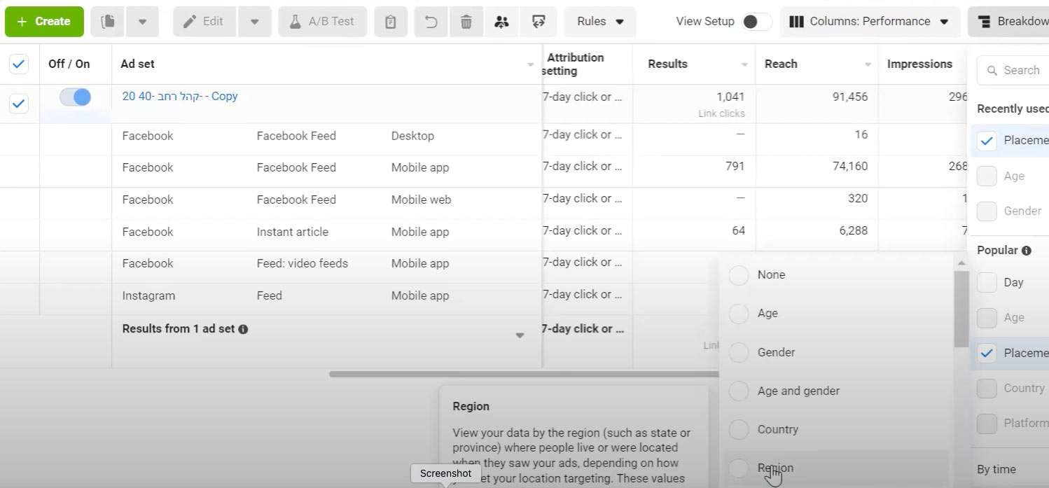 Placement – הפלטפורמה שממנה זה הגיע. בדוגמה מעל, מתוך 1041 הקלקות הכל רץ בפייסבוק וקצת באינסטגרם. אבל אני יכול בכל קמפיין שאני מריץ בשתי הפלטפורמות, אני יכול ללכת ל-Breakdown לפי Placement ולראות את החלוקה.