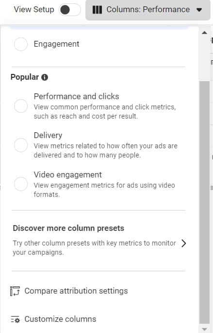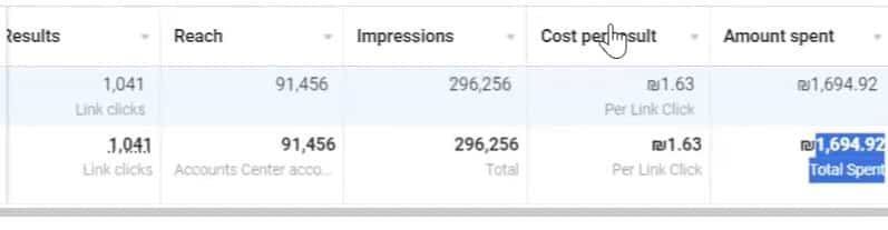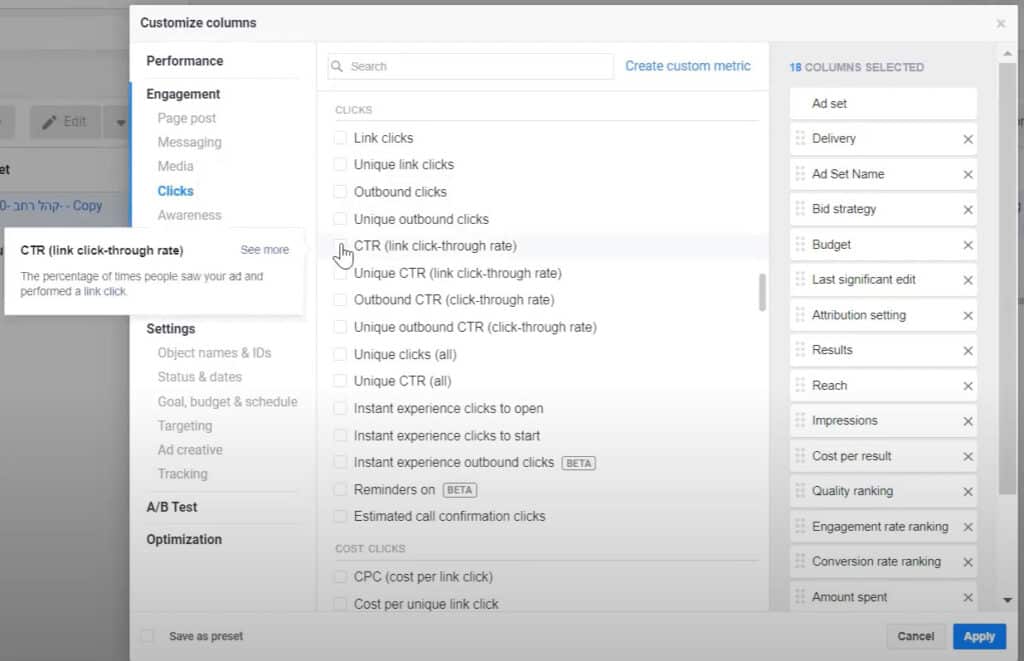 מעבר ליכולת לראות את המדדים האלה בצורה עמוקה יותר, יש לי יכולת לראות את הטבלה עם מדדים נוספים. המדדים הנוספים הללו משתנים לפי סוג הקמפיין שרץ. כי זה כבר משנה. כי לפי סוג קמפיין יש מדדים שונים שרלוונטיים אליו. לדוגמא אנחנו בקמפיין טראפיק יש מדדים ספציפיים שרלוונטיים לטראפיק.