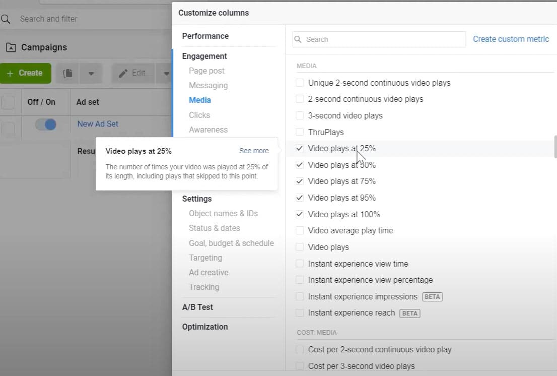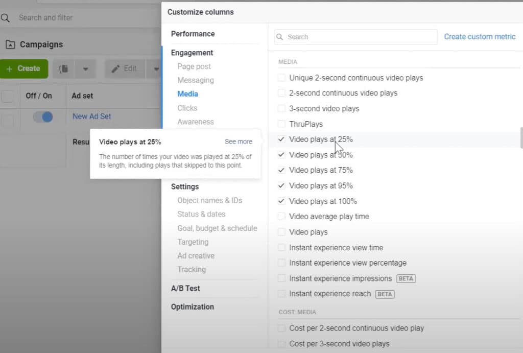 בקמפיין של סרטונים מומלץ ללכת ל- Customize columns משם ל-Media ולסמן את משכי הצפייה, כלומר אני יכול לדעת לא רק כמה צפו בסרטון אלא גם עד איזו נקודת זמן. עד הרבע, עד החצי, עד השלושת רבעי זמן מהסרטון או כמעט עד סופו.