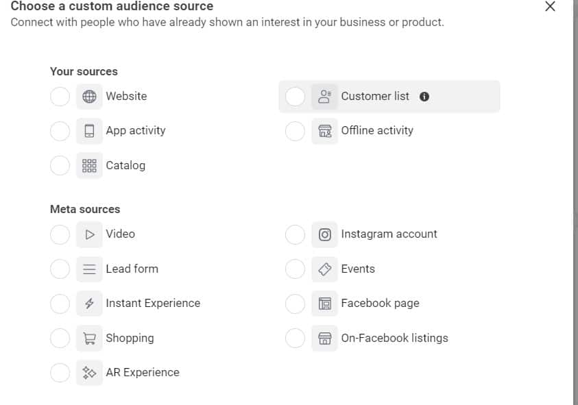 בין סוגי הרימרקטינג האפשריים תוכלו למצוא את האפשרות לטרגט את מי שצפה בסרטון  שהעליתם, את מי שביקר בעמוד העסקי שלכם בפייסבוק או באינסטגרם – וכמובן כל מי שהגיב או יצר אינטראקציה עם הנכסים הדיגיטליים שלכם. תוכלו, בשלב מאוחר יותר, גם לטרגט את מי שביקר בלינק שלכם אך לא ביצע  רכישה.
